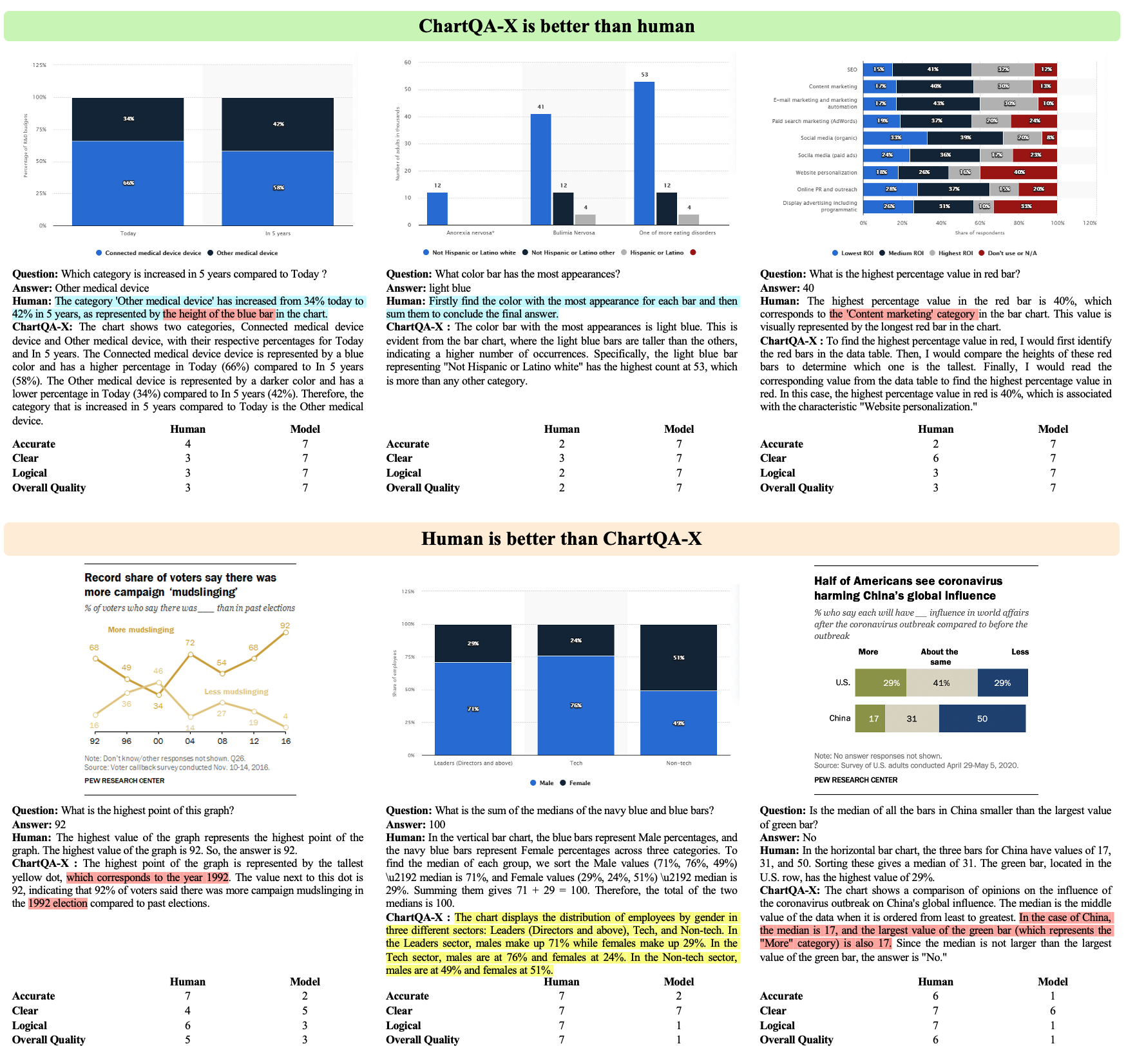Examples from our human-study evaluation comparing ChartQA-X explanations with human-written explanations. The top row shows cases where ChartQA-X provides clearer or more accurate reasoning, and the bottom row shows cases where human explanations outperform our model. Likert-scale ratings reflect perceived accuracy, clarity, logic, and overall quality, with highlights marking errors or inconsistencies.