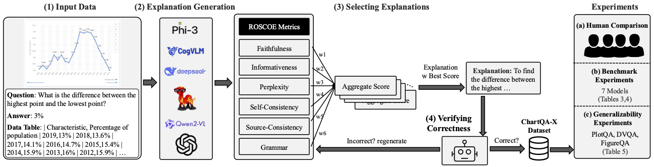 The ChartQA-X pipeline generates and selects high-quality explanations using six VLMs and ROSCOE metrics, followed by correctness checks and evaluations across human studies, benchmarks, and generalization tests.