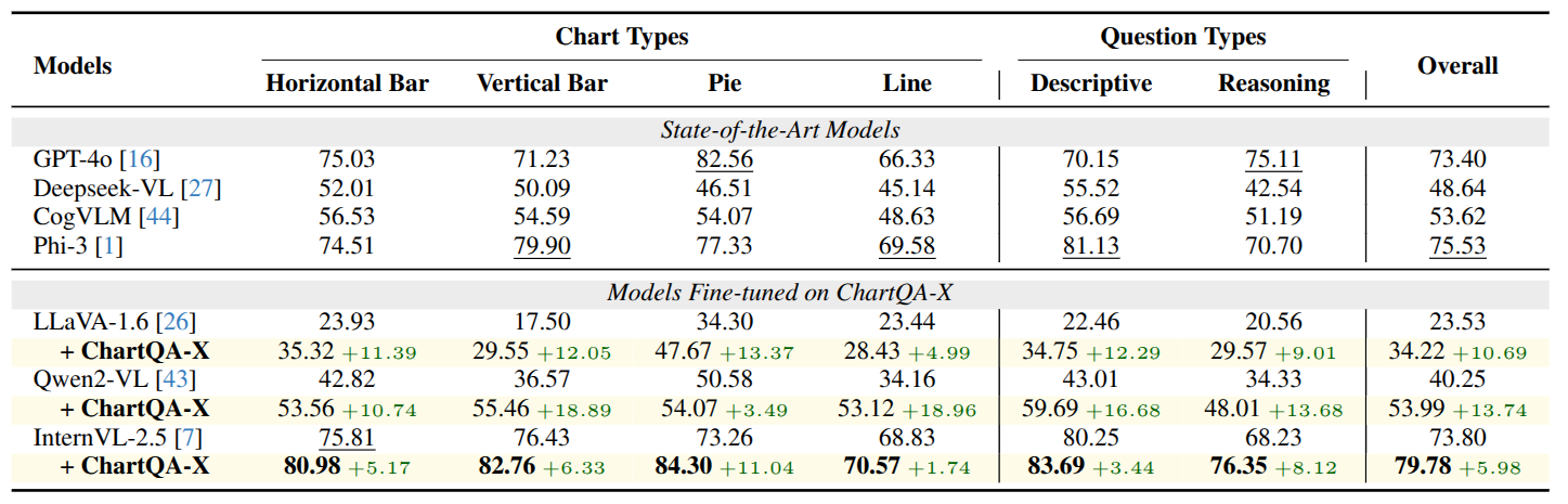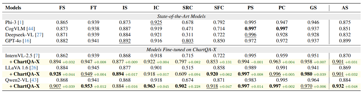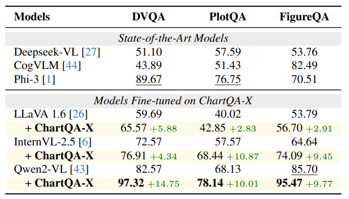 Generalization results on other chart datasets. Models trained on ChartQA-X transfer more effectively to DVQA, PlotQA, and FigureQA, showing stronger cross-dataset robustness. Best scores are bold and second-best are underlined.